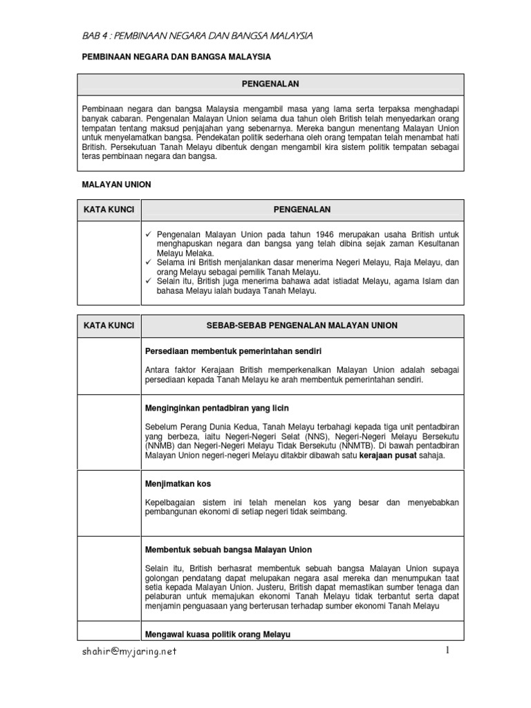 Sejarah Kertas 3 Bab 4 Docx Soalan Kertas 3 Bab 4 Pembinaan Negara Dan Bangsa Malaysia Tema Tajuk 11 1 Pembinaan Negara Dan Bangsa Malaysia Course Hero from www.coursehero.com Majlis tindakan bersama seluruh malaya atau all malayan council of joint action (amcja) dan pusat tenaga rakyat (putera) telah ditubuhkan pada awal tahun 1947 untuk menentang british dan umno. Sejarah pembentukan malayan union pada hari ini dalam tahun 1946, tanah melayu telah diletakkan di bawah sistem pentadbiran yang dikenali sebagai malayan union bagi menggantikan pemerintahan sementara iaitu pentadbiran tentera british atau bma. Merupakan salah satu usaha british untuk menghapuskan negara dan bangsa malaysia yang telah di bina sejak zaman kesultanan melayu melaka. Mengapakah orang melayu membantah malayan union yang diperkenalkan oleh british di tanah melayu pada tahun 1946? Pada 10 februari 1946, satu lagi tunjuk perasaan disertai oleh 15 000 orang melayu termasuk wanita diadakan di johor. 1 nisan 1946'da, malayan birliği resmi olarak sir edward gent'in valisi olarak, federe malay eyaletleri, federal olmayan malay devletleri ve penang ve malacca boğazlar yerleşimlerini tek bir yönetim altında birleştirerek resmen ortaya çıktı. It was the successor to british malaya and was conceived to unify the malay peninsula under a single government to simplify administration. Pengenalan malayan union pada tahun 1946 selama dua tahun oleh british diisytiharkan pada 1 april 1946 di king's house, kuala lumpur.